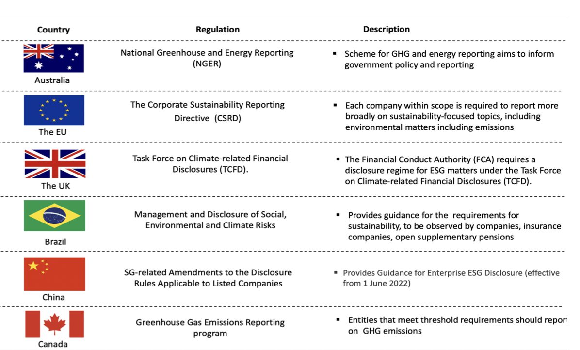 Australia has enforced mandatory emissions reporting under the National Greenhouse and Energy Reporting Scheme (NGERS) since 2007, setting a precedent for comprehensive emissions accountability. Additionally, numerous other countries, including Brazil, Canada, Hong Kong, New Zealand, and Singapore, have expressed intentions to make climate or sustainability disclosures mandatory, further underscoring the global shift towards corporate transparency and environmental responsibility.