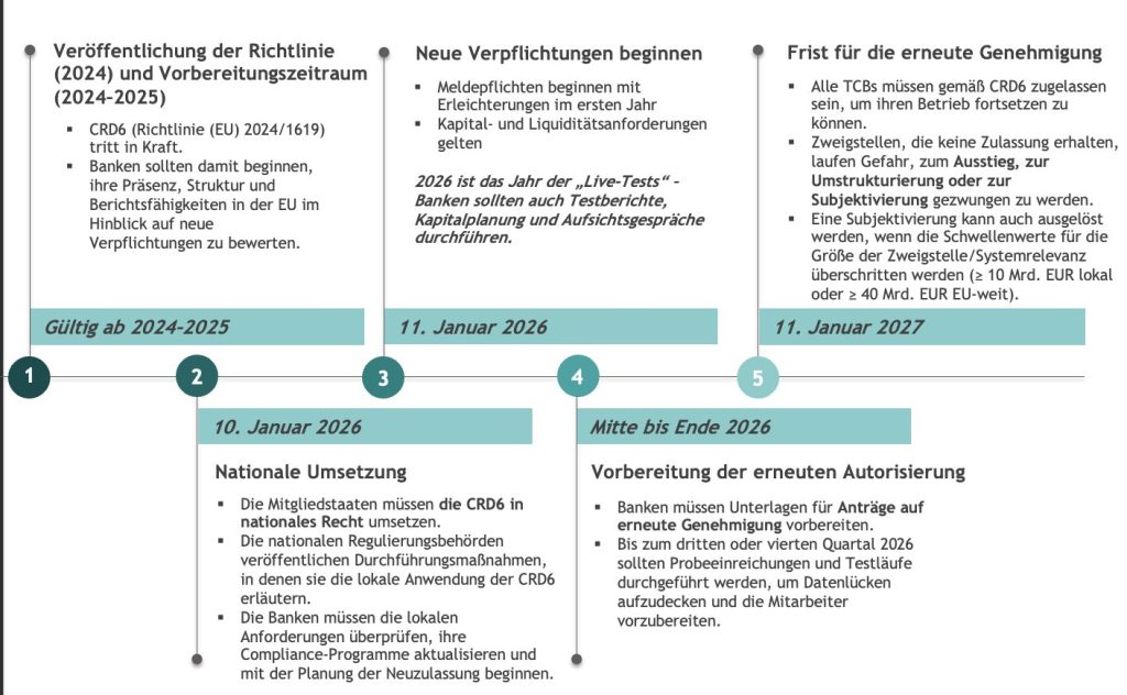 Die neue Eigenkapitalrichtlinie der EU (CRD6 / Richtlinie (EU) 2024/1619) harmonisiert die Vorschriften für Drittlandsbanken in der EU. Ab dem 11. Januar 2027 dürfen ausländische Banken keine grenzüberschreitenden Kernbankdienstleistungen mehr erbringen; sie müssen über eine zugelassene EU-Zweigstelle oder -Tochtergesellschaft tätig sein.